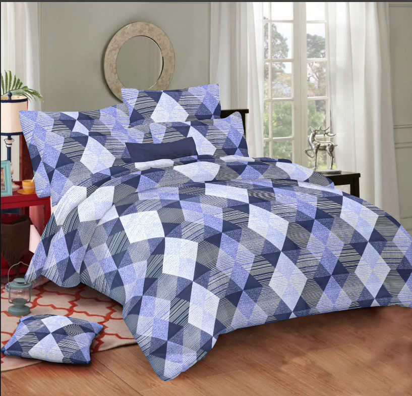 Blue & white Geometric pattern cotton Double Bed Bedsheet with 2 Pillow covers