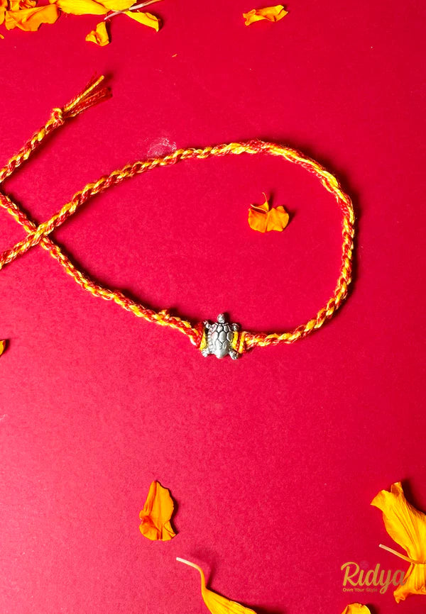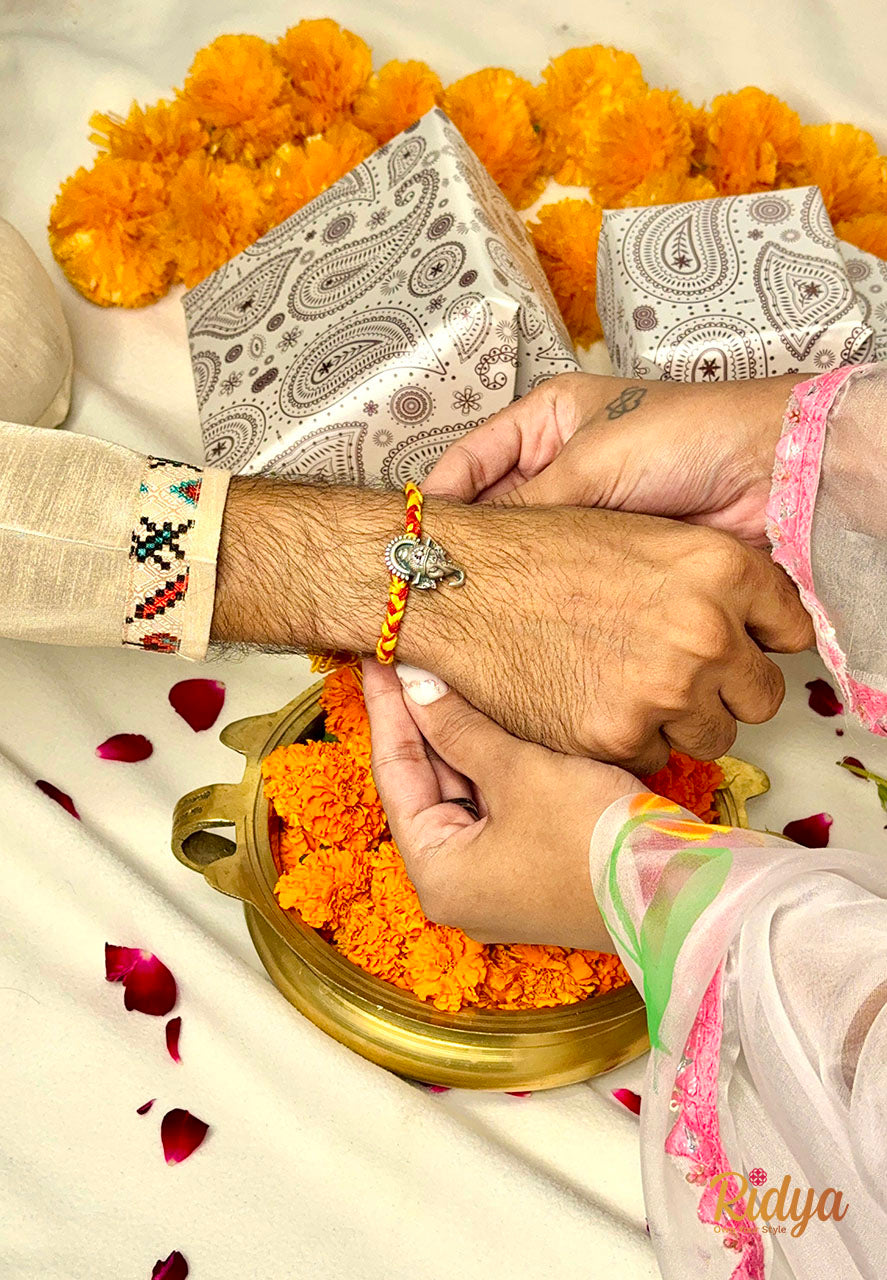 Detailed Carved Ganesha Silver plated Rakhi Cum Pendant- An auspicious pure silver plated rakhi featuring a carved ganesha motif. This Rakhi can be used as a pendant or a keychain with a loop on the Ganesha Motif.