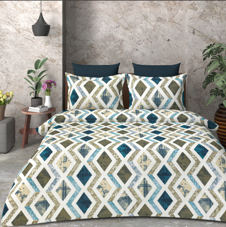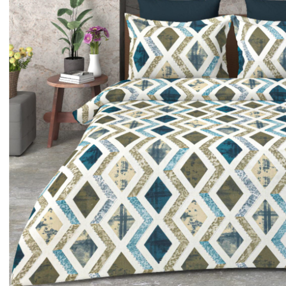 White & Blue Geometric-Printed Double Bedsheet with 2 Pillow Covers